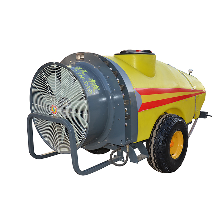 ట్రైల్డ్ ఎయిర్ బ్లాస్ట్ స్ప్రేయర్ ట్రాక్టర్ వెనుక వెనుకంజలో ఉండేలా రూపొందించబడింది మరియు అధిక పీడన గాలి ప్రవాహాన్ని సృష్టించే అభిమానితో అమర్చబడి ఉంటుంది. ఈ గాలి ప్రవాహం స్ప్రే బిందువులను నాజిల్స్ నుండి బయటకు తీస్తుంది మరియు వాటిని ఆకుల ద్వారా కదిలిస్తుంది, తద్వారా ఆకుల ఎగువ మరియు దిగువ ఉపరితలాలను పూత చేస్తుంది.